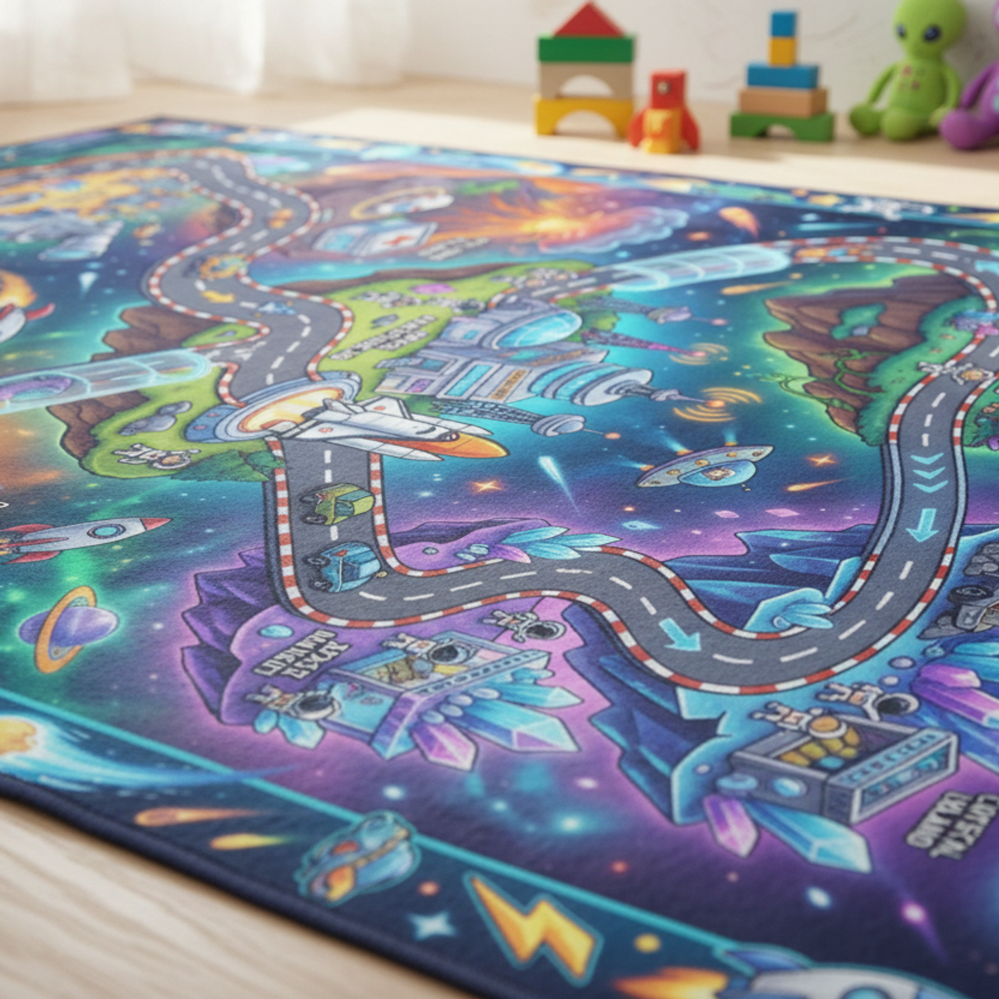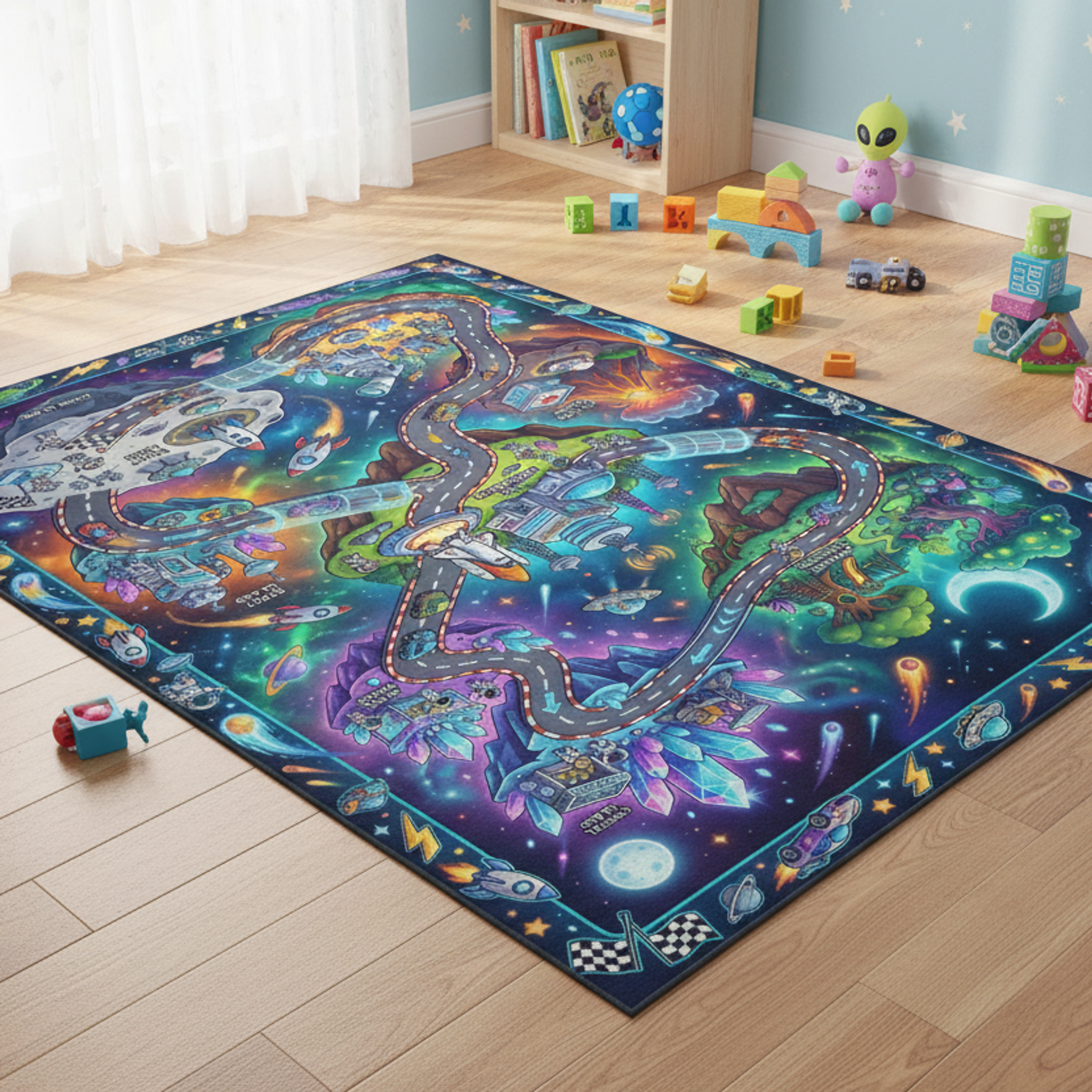 Transform your child's room into an imaginative space with this vibrant Space Adventure Eco Rug! Featuring playful rockets, astronauts, and colorful planets, this rug is perfect for adding a touch of fun to any nursery or playroom. I've designed this rug to spark creativity and adventure, all while being eco-friendly and soft underfoot. Imagine your little one exploring their own galaxy right in their room! It's made with recycled fibers and a non-slip base so it’s durable for everyday play. This rug makes a wonderful birthday or baby shower gift for the budding astronaut in your life. Bring a unique piece into their world!