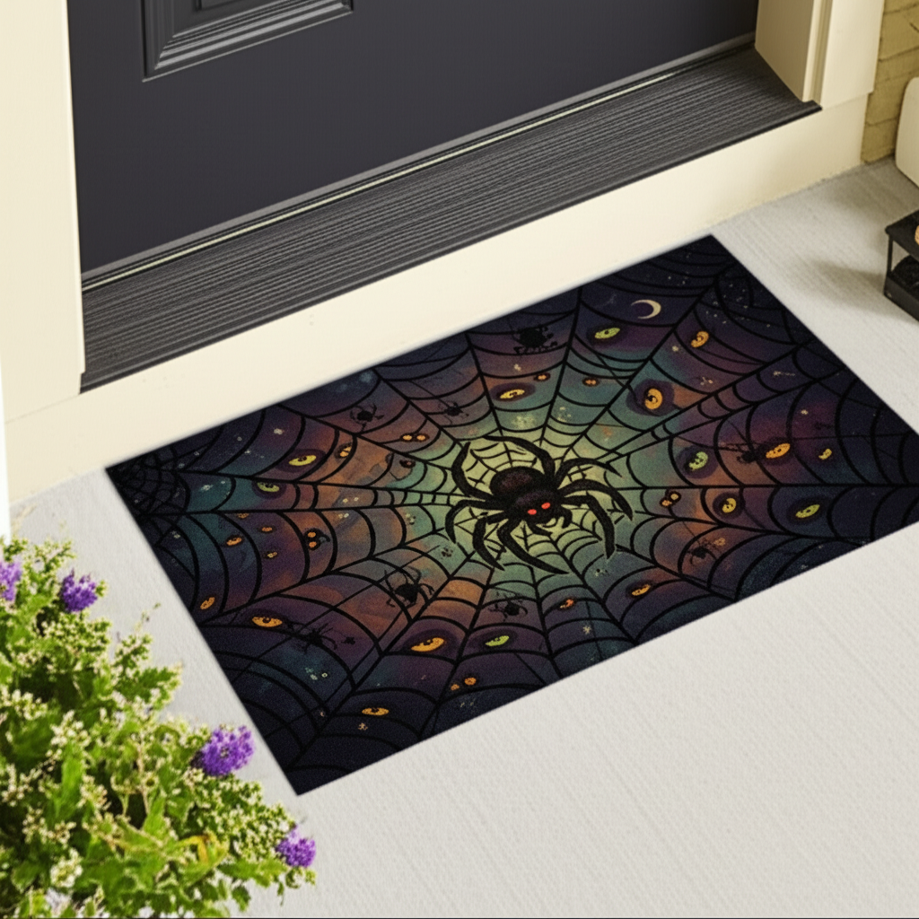 Welcome guests with a spooky spectacle. This doormat features a striking spiderweb design. With spiders, glowing eyes, and celestial accents against a dark backdrop, it adds a touch of eerie elegance to your doorstep.