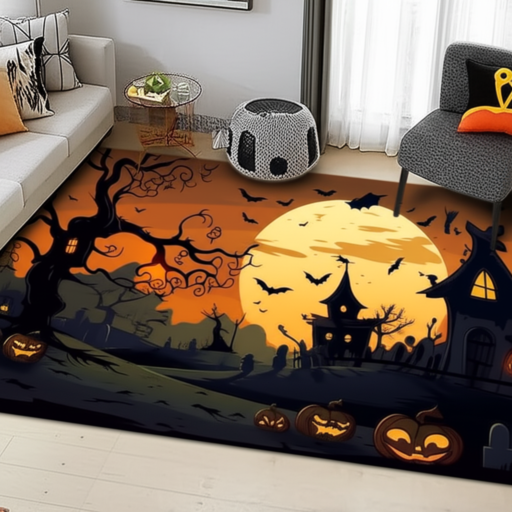 Transform your space with this playful Halloween-themed rug. It features a charming scene of a spooky house, bats, and pumpkins against an orange sky and full moon, creating a festive and inviting atmosphere. The perfect addition to bring a touch of Halloween magic to your floors.