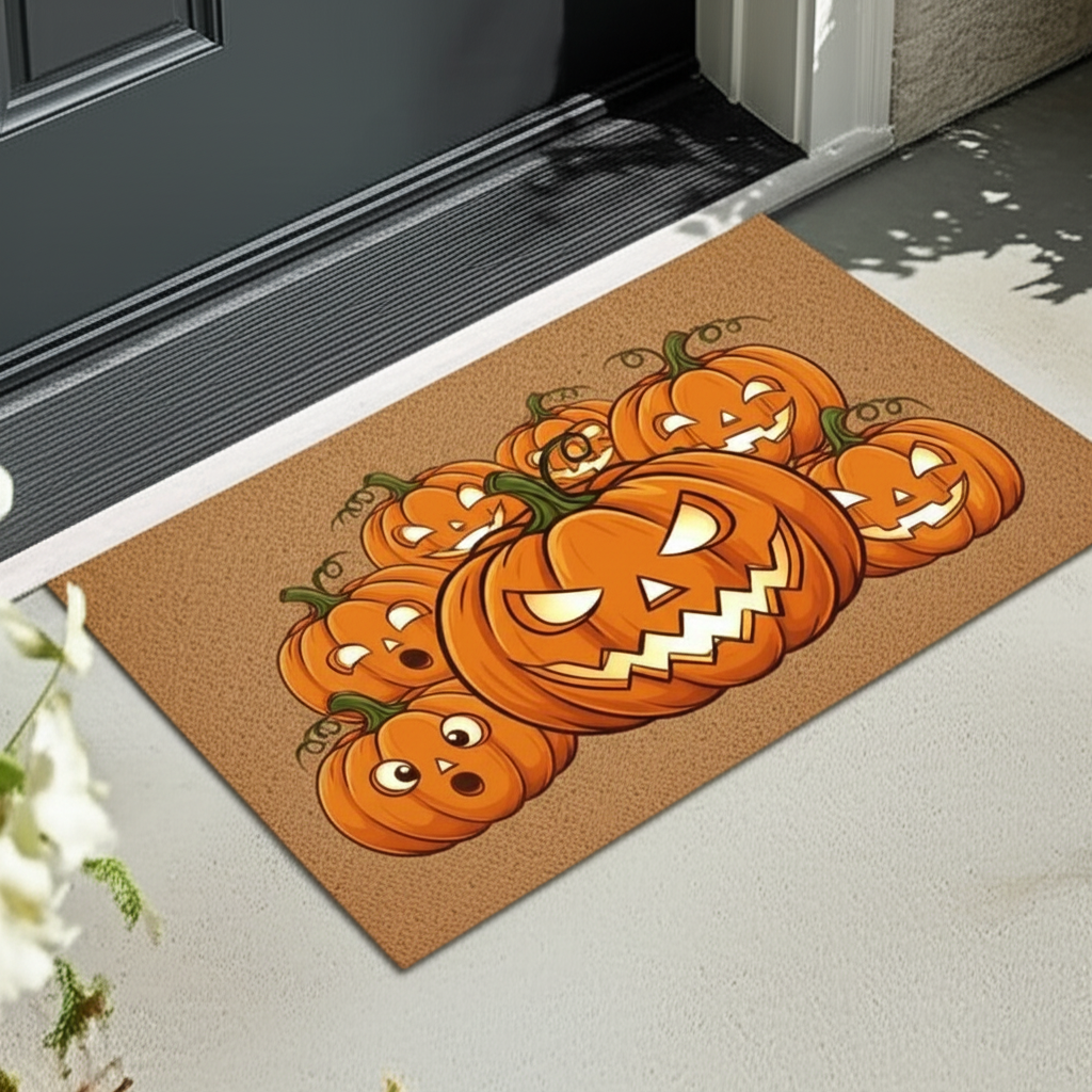 Welcome guests with this charming doormat featuring a group of cartoon jack-o'-lanterns. Each pumpkin has a unique expression, adding a touch of whimsy and spooky fun to your doorstep. The warm orange tones and playful design create a festive and inviting entrance for the Halloween season.