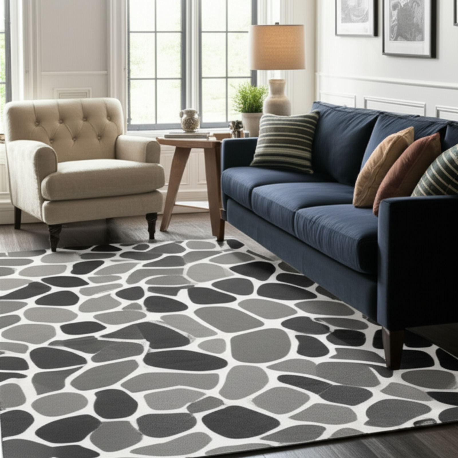 Elevate your living space with this stunning Stone Pebble Premium Rug. The elegant design features a calming array of gray, white, and taupe stones, creating a serene coastal vibe in any room. Perfect for modern living rooms, bedrooms, or entryways, this rug adds a touch of sophistication and comfort to your home decor. Imagine sinking your feet into the soft-touch surface after a long day – a true sensory delight! Its abstract pattern is also versatile enough to complement a variety of interior styles, making it a seamless addition to your existing furniture and décor. This rug makes a thoughtful housewarming gift, a stylish treat for yourself, or a special surprise for anyone who appreciates modern and minimalist design.