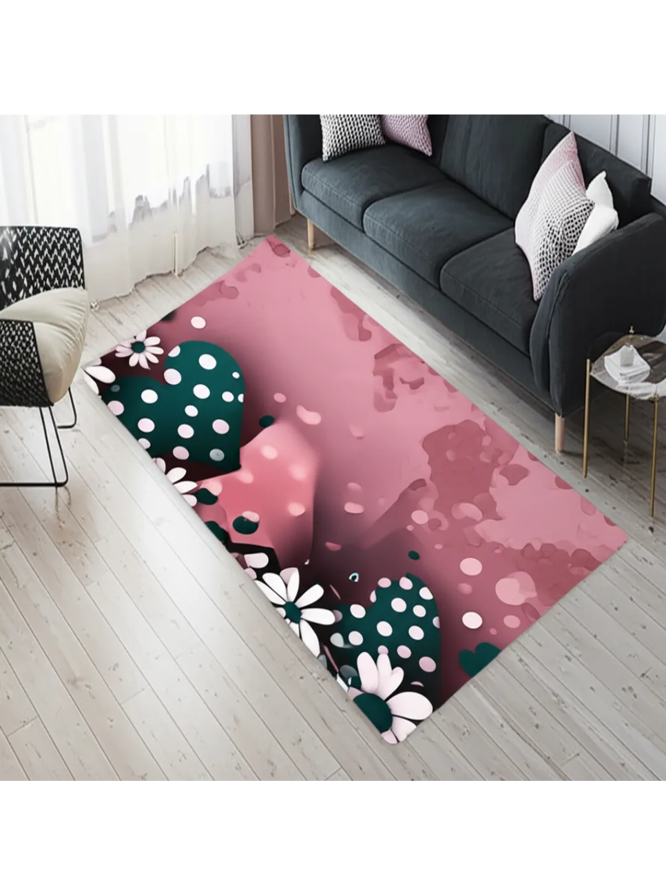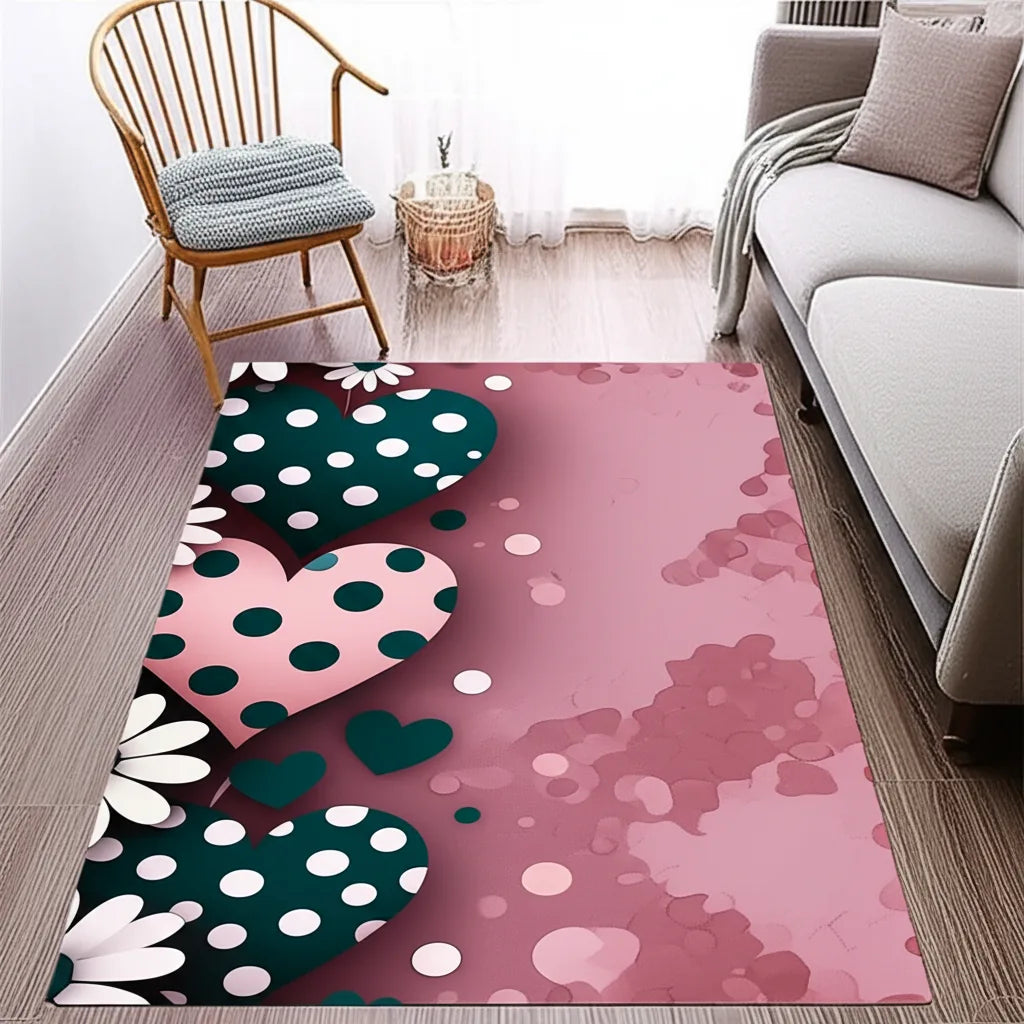 Adorn your floors with whimsical charm. This rug features an array of polka-dotted hearts and delicate daisies against a soft rose backdrop. It's a lovely accent for any space.