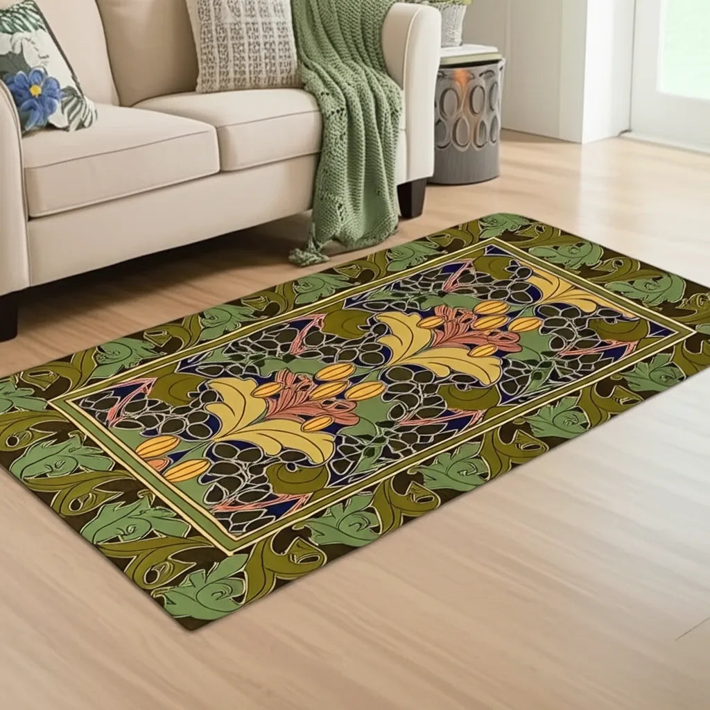 This rug features a symmetrical vintage floral pattern in shades of green, yellow, and coral. It's a bold and beautiful design that is sure to make a statement in any space. The dark background ensures a vibrant look that is full of life.