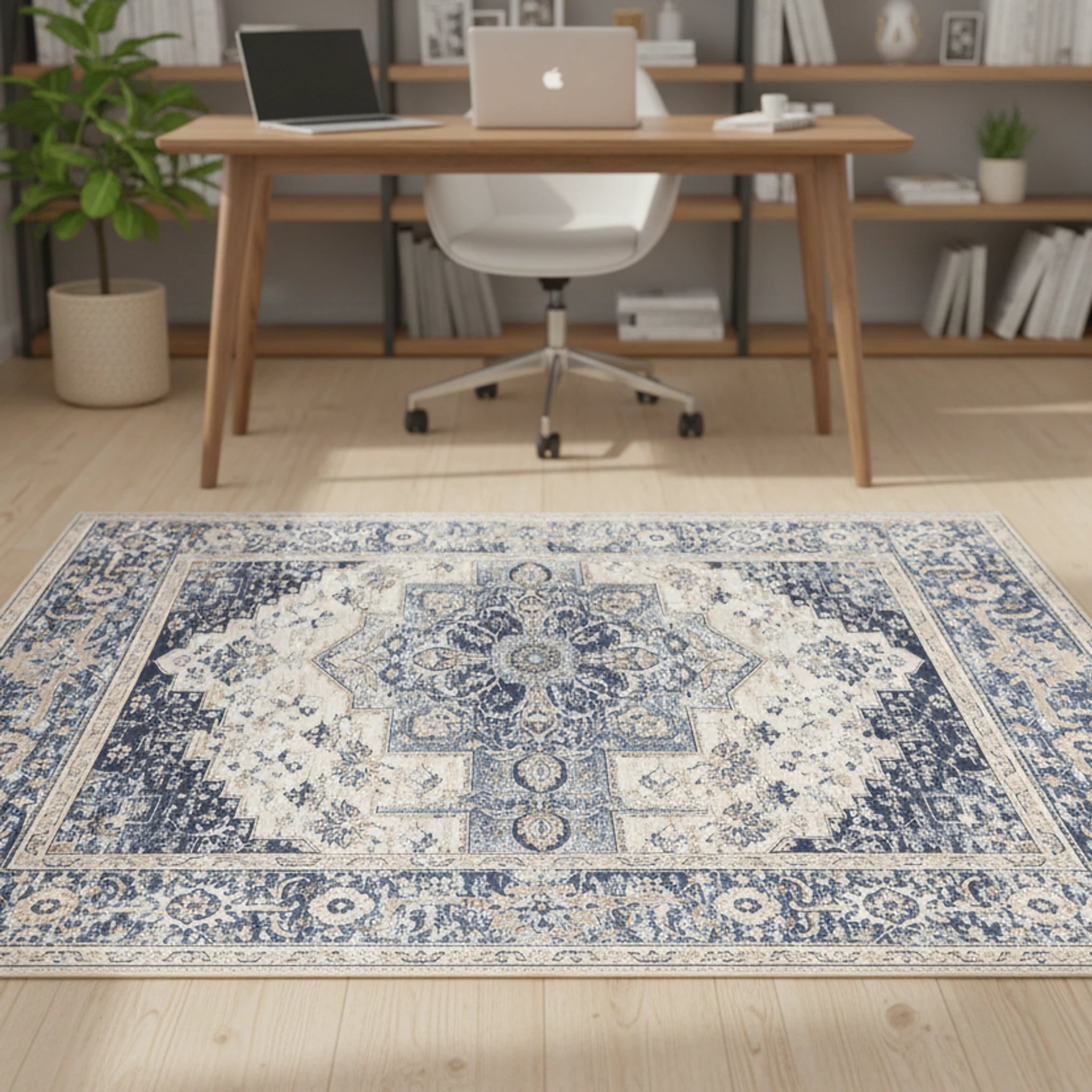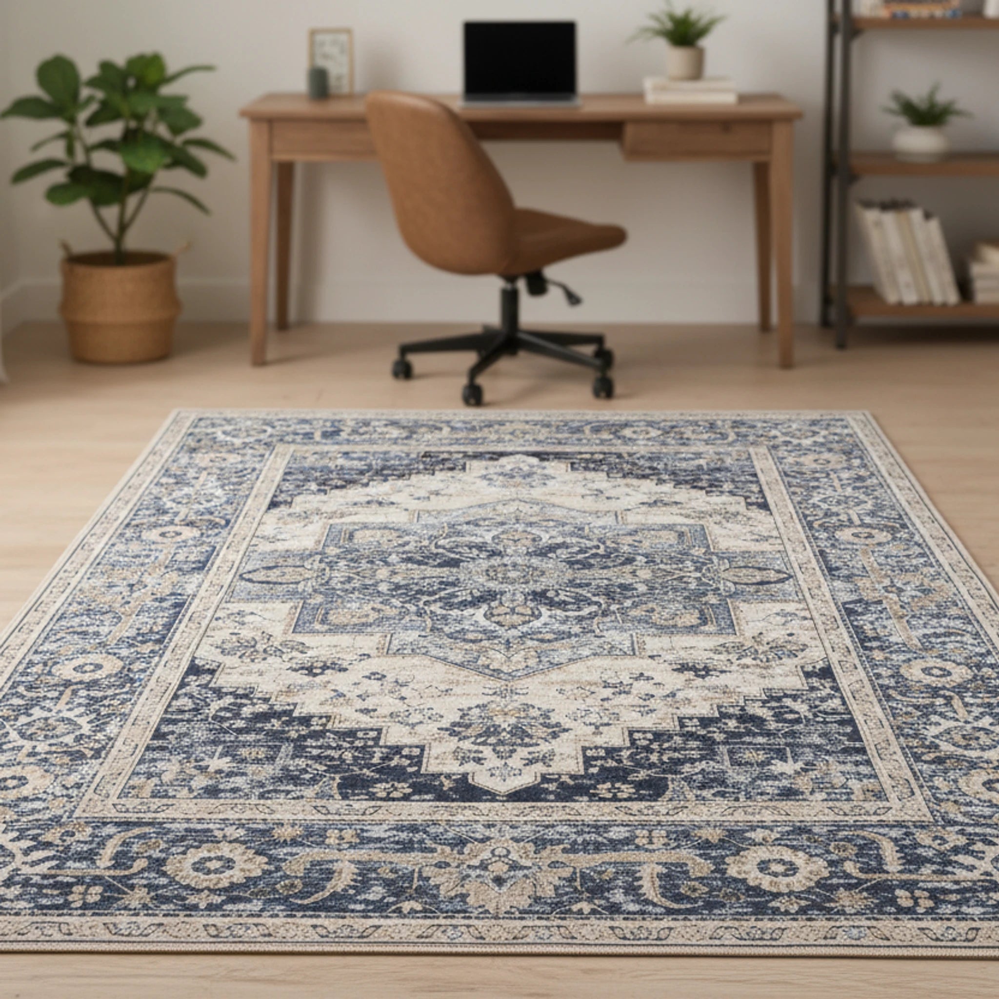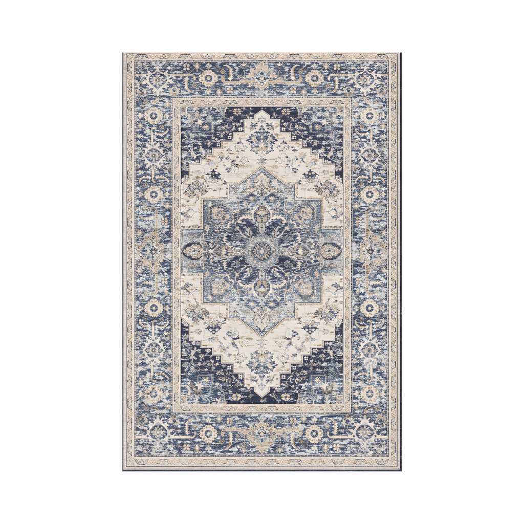 Dreamy vintage medallion rug for living room! This eco rug showcases floral medallions and geometric borders in cream, navy, and taupe, adding elegance to your home decor.