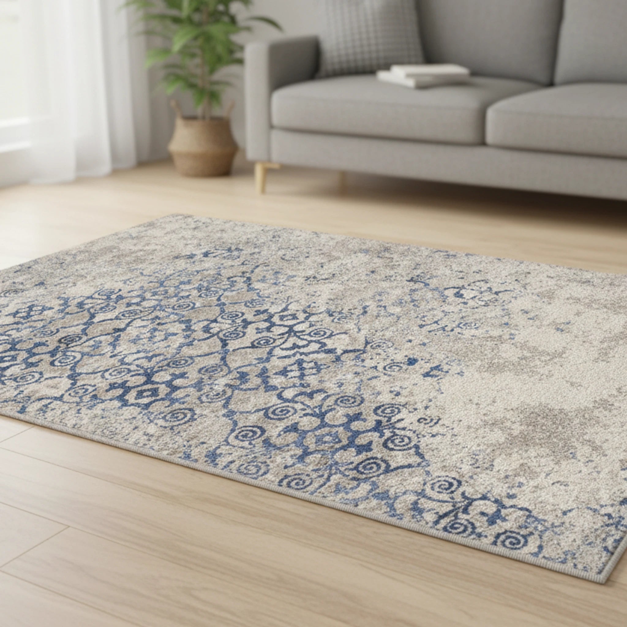 Adorn your living room with this vintage medallion rug! Its floral swirls and distressed texture add a touch of faded elegance. Perfect as a statement piece with its creamy beige and dusty blue tones.