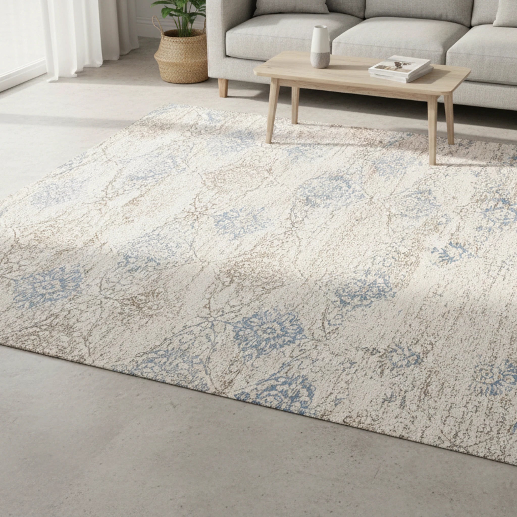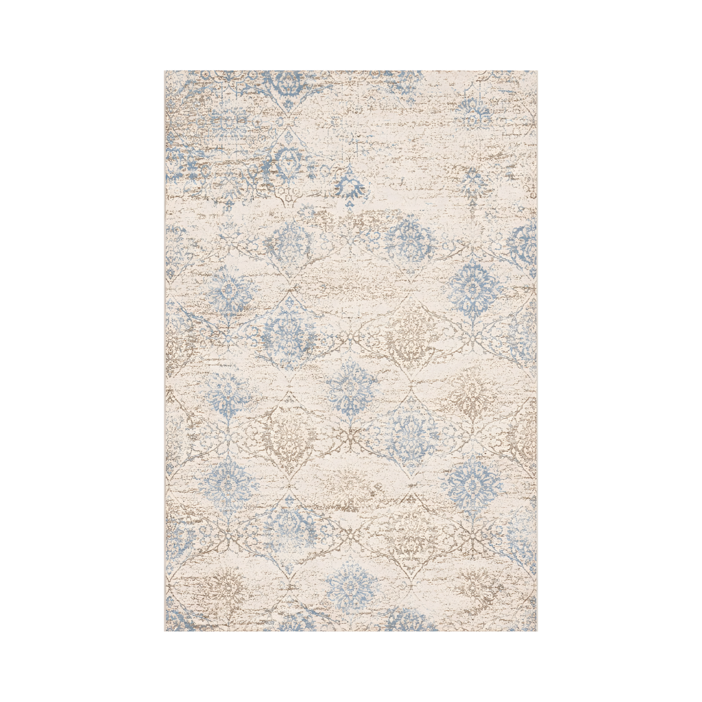 The rug showcases a distressed texture and arabesque elements, rendered in a palette of creamy beige, dusty blue, and taupe. The overall aesthetic evokes a sense of vintage charm, adding character and warmth to any room.