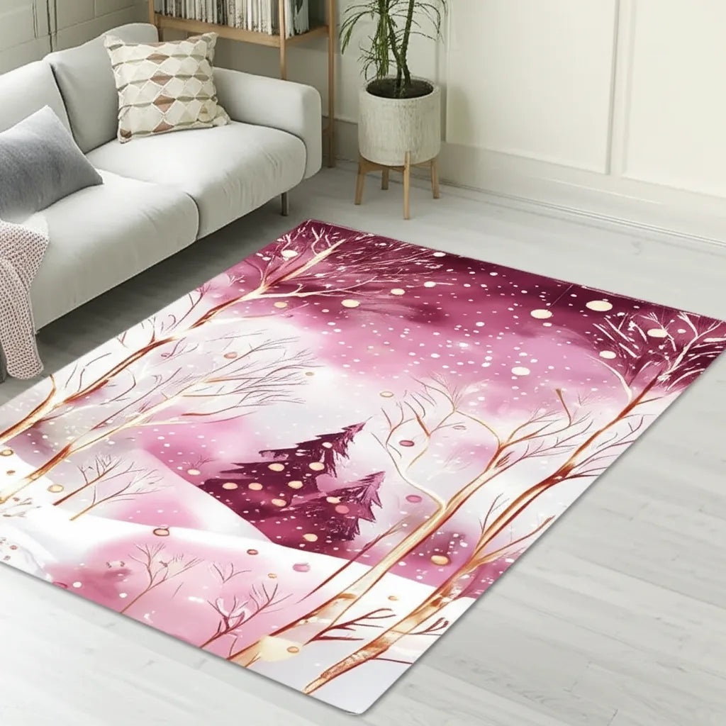 This rug depicts a winter wonderland with pink skies and falling snow. The scene features bare trees adorned with delicate ornaments and snow-covered hills. It will add a touch of festive charm to any room.