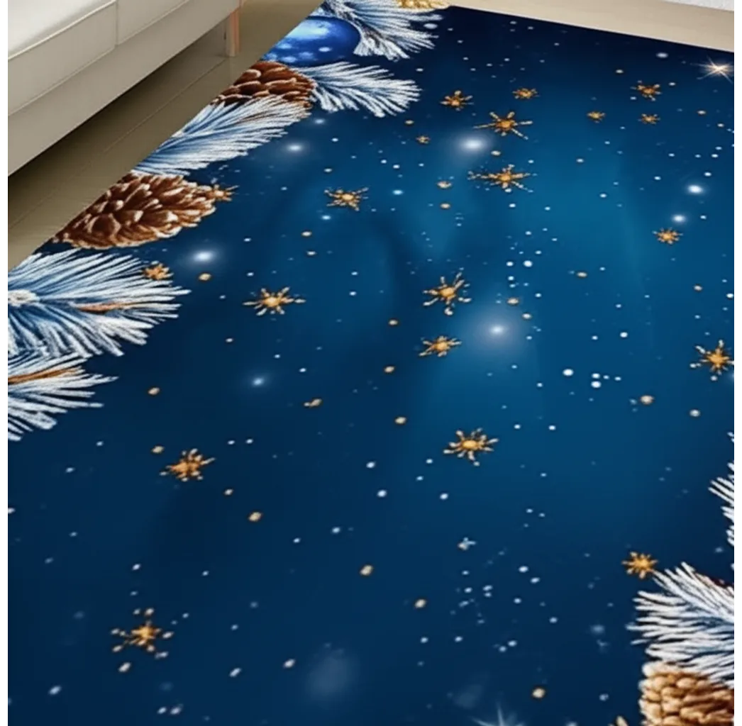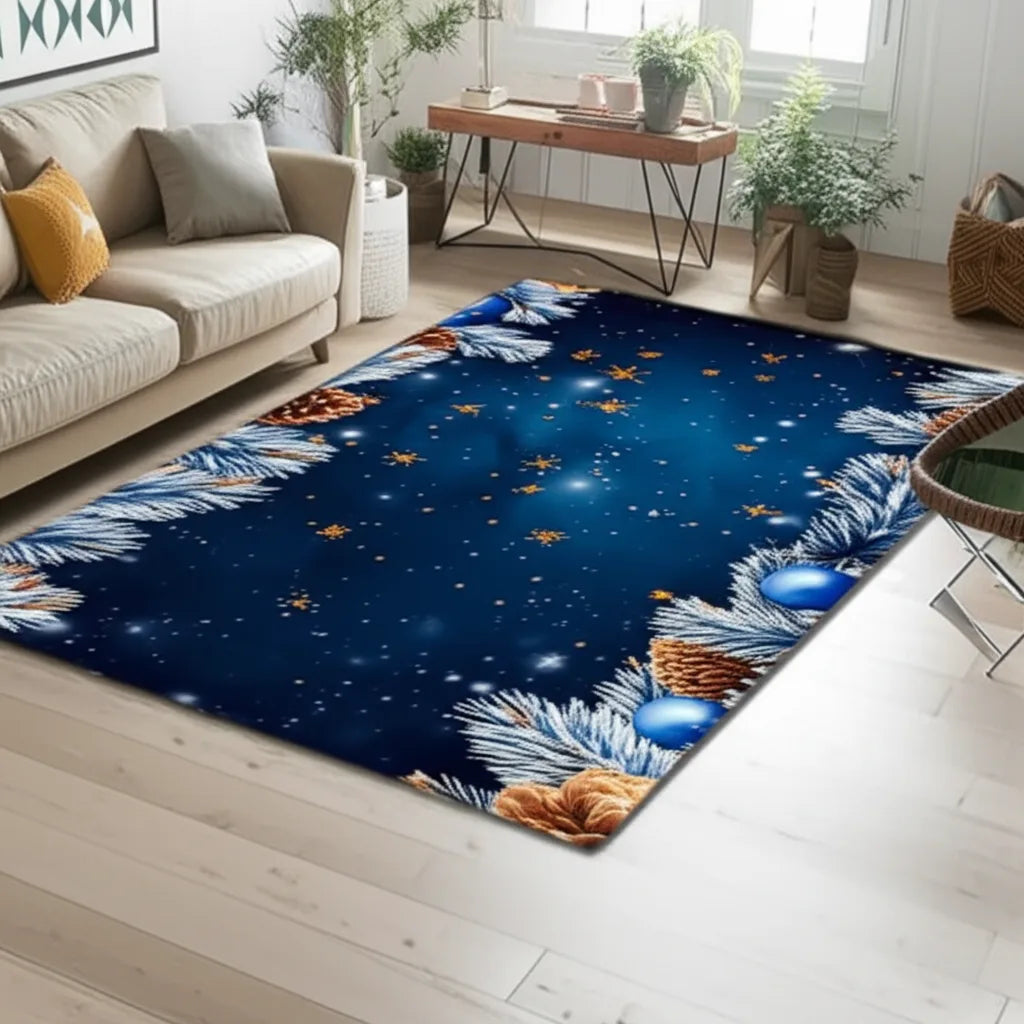 This rug features a festive design of pinecones, blue ornaments and snow-covered evergreen branches against a twinkling, deep blue background. With its seasonal, colorful and textural details, this rug would be a welcome addition to any holiday decor. It’s sure to bring a cozy, wintery touch to your home.