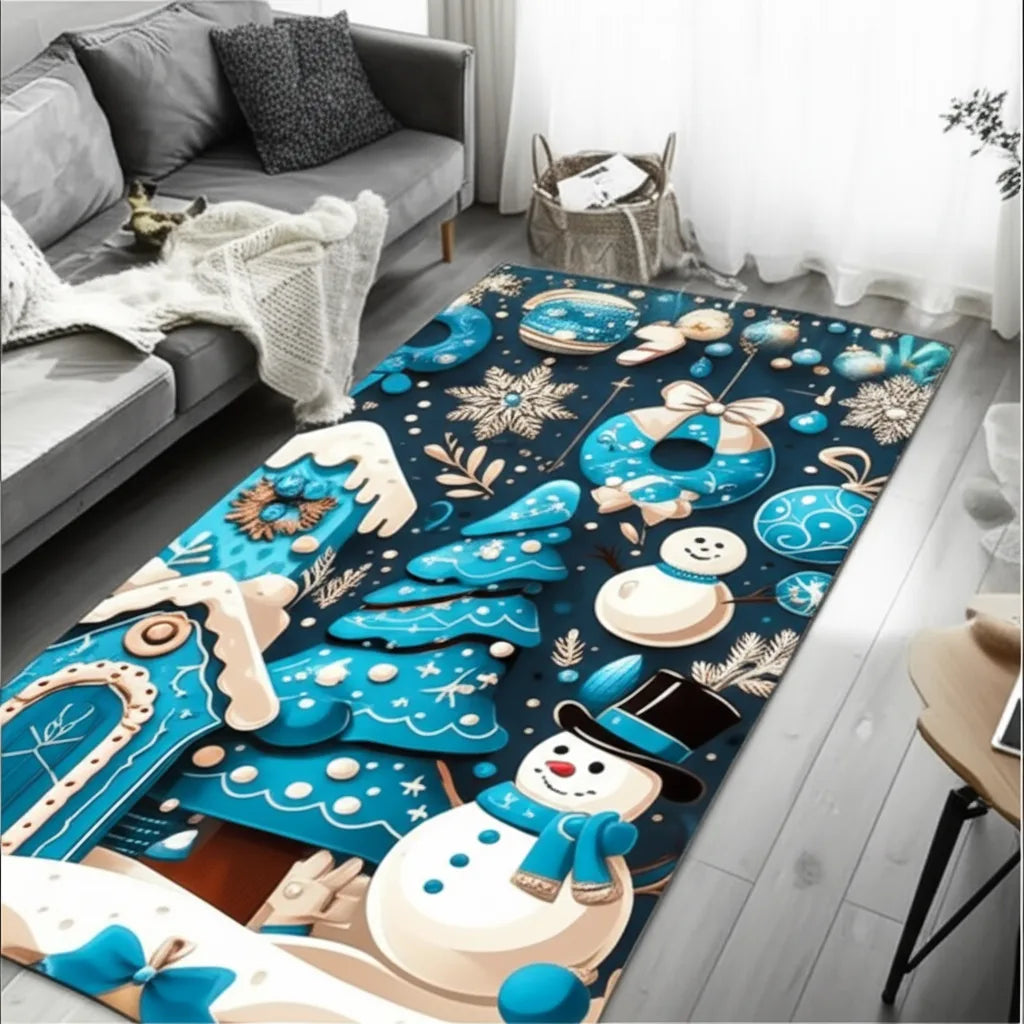 This festive rug showcases a delightful Christmas scene in cool blue tones. Snowmen, ornaments, and gingerbread houses create a whimsical and inviting pattern. The detailed illustrations and soft color palette will add a touch of holiday magic to any room.