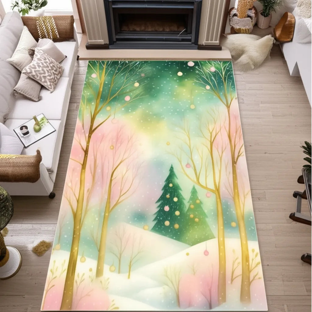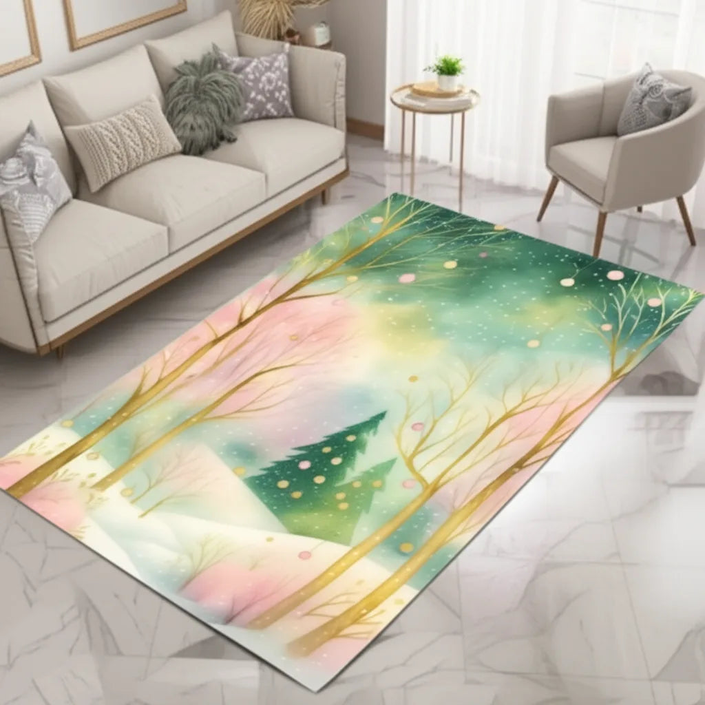 This rug features watercolor trees and falling snow in pastel colors. The design is whimsical and would be perfect for the holidays. The colors are soft and inviting, making it a great addition to any room.