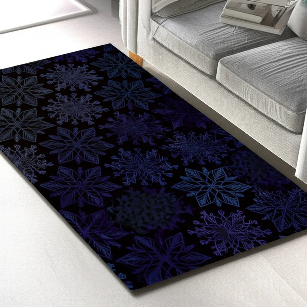This rug features a pattern of snowflakes in shades of blue and purple on a black background. The simple line-work gives this rug an eye-catching, modern look. This rug would be a beautiful addition to any room during the winter season.